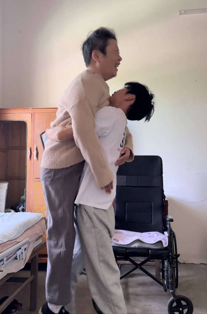 母亲右脚完全动不了,平时需要上下床或起身都需要他抱上抱下:“我身高1.73米、100斤,我妈1.64米、120斤,刚开始抱着还是挺费力的,腰痛得不行。”为了更有力量抱母亲,他从今年1月开始健身,主要练背和上肢。一年下来,他手臂和背部的肌肉更加明显,引体向上从勉强能做一两个到轻轻松松做十个,抱母亲也抱得更稳了。